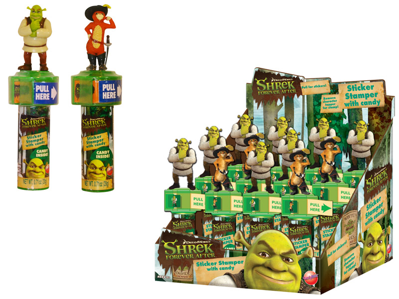 Item 10658: Shrek and PussNBoots adorn these sticker stampers! Pull the tab for Shrek stickers, stamp your pages with the Shrek rubber stamper, or just eat the included microbites candy! Packed (6) 12 count displays per case.